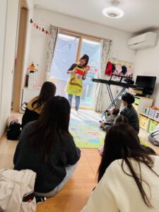毎月のリトミックとは違い、ママと一緒に保育室に入り、歌をうたったりリズムに合わせて身体を動かしたりして楽しみました。